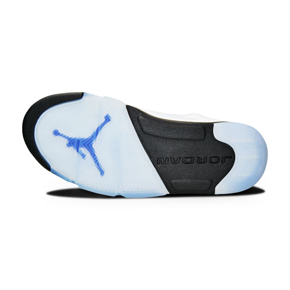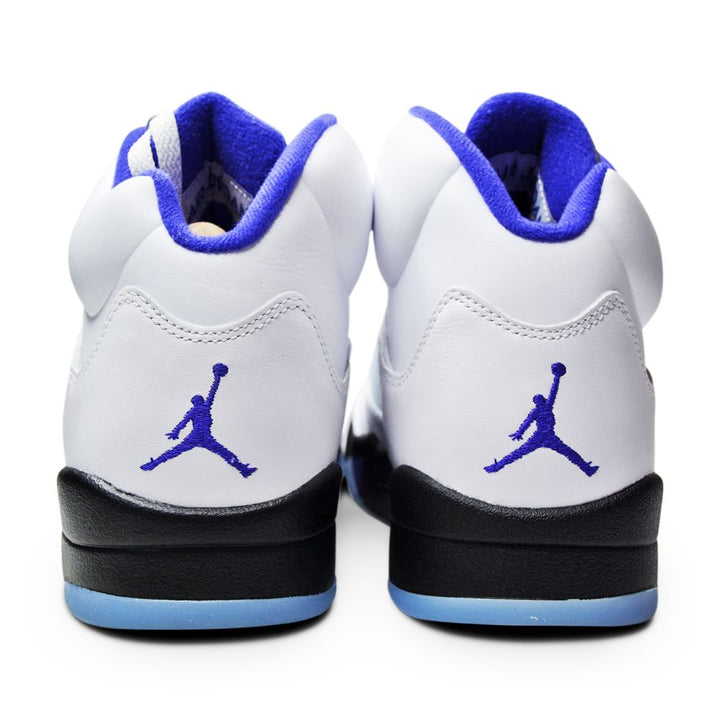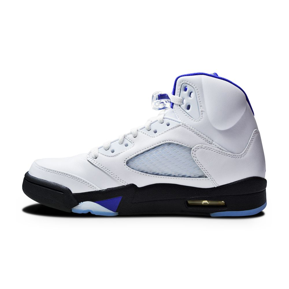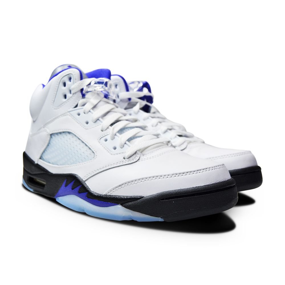 Dressed in a White, Dark Concord, and Black color scheme. This offering of the Air Jordan 5 features a clean White leather upper paired with Concord contrasting accents throughout and sockliner. 3M reflective tongues, Black midsole atop an icy translucent outsole completes the design.