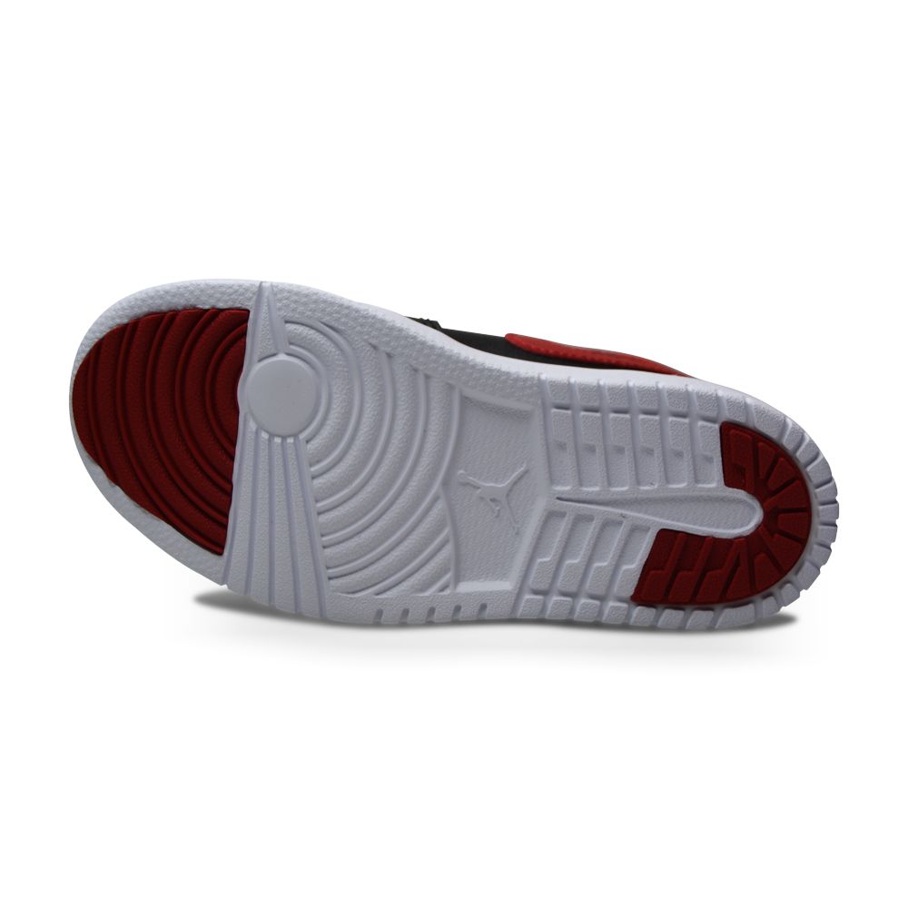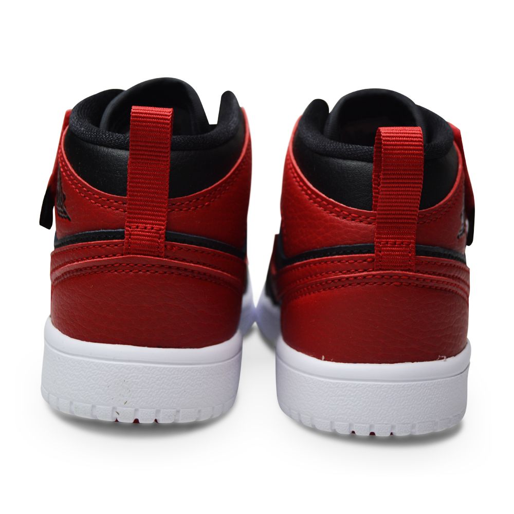 The Air Jordan 1 Mid Banned 2020 is a colorway of Michael Jordan s first signature shoe that draws comparisons to the design of the Nike Air Shoe that Jordan was prohibited from wearing in the NBA in 1985. Tthe Jordan 1 Mid Alt shoe gives Adults the legendary style of AJ 1 with easy application and removal. It is designed by the Maestro Peter Moore and has been given the nickname Banned. Contrasting black leather detailing can be found on the forefoot, mid-panel, and collar. Fiery red leather Swoosh branding appears on either side and a black Wings logo dots the collar overlay. Easy slip on with velcro fastening, this pre-school version is a must have