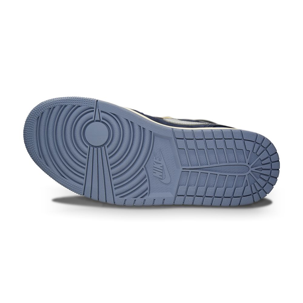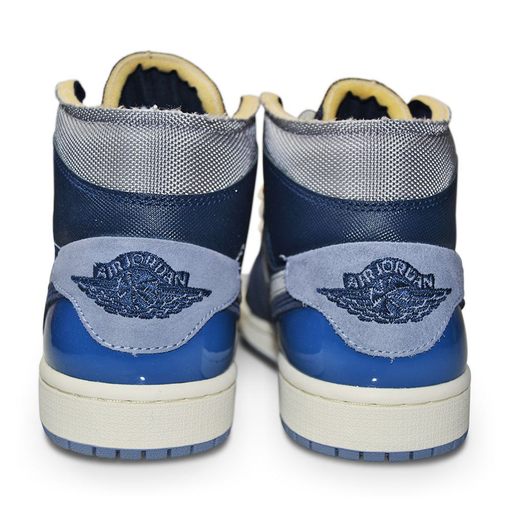 Recently commanding its AJ1 low-top equivalent with hits of Navy, a similar ensemble takes hold here with “Obsidian” colored mesh mudguards, collar panels and tongue while the midfoots suede panels are additionally color-matched. The aforementioned texture concludes on the added heel counter finished in an “Ashen Slate” affixed with a black winged insignia. Remaining disparate from its typical construction, glossy patent leathers join at the perforated vamp, quarter overlay and debossed heel section establishing itself in a “French Blue” hue before concluding in the presiding Smoke Grey that fills the Swoosh. Underfoot an aged “Sail” midsole works in tandem with the light lilac tread before the light tan accent returns amidst the laces and exposed collar lining.