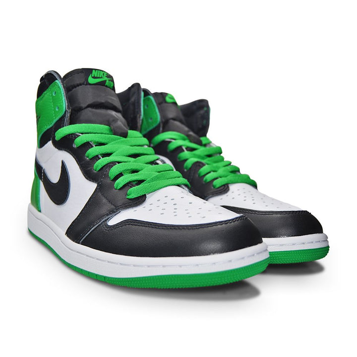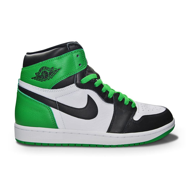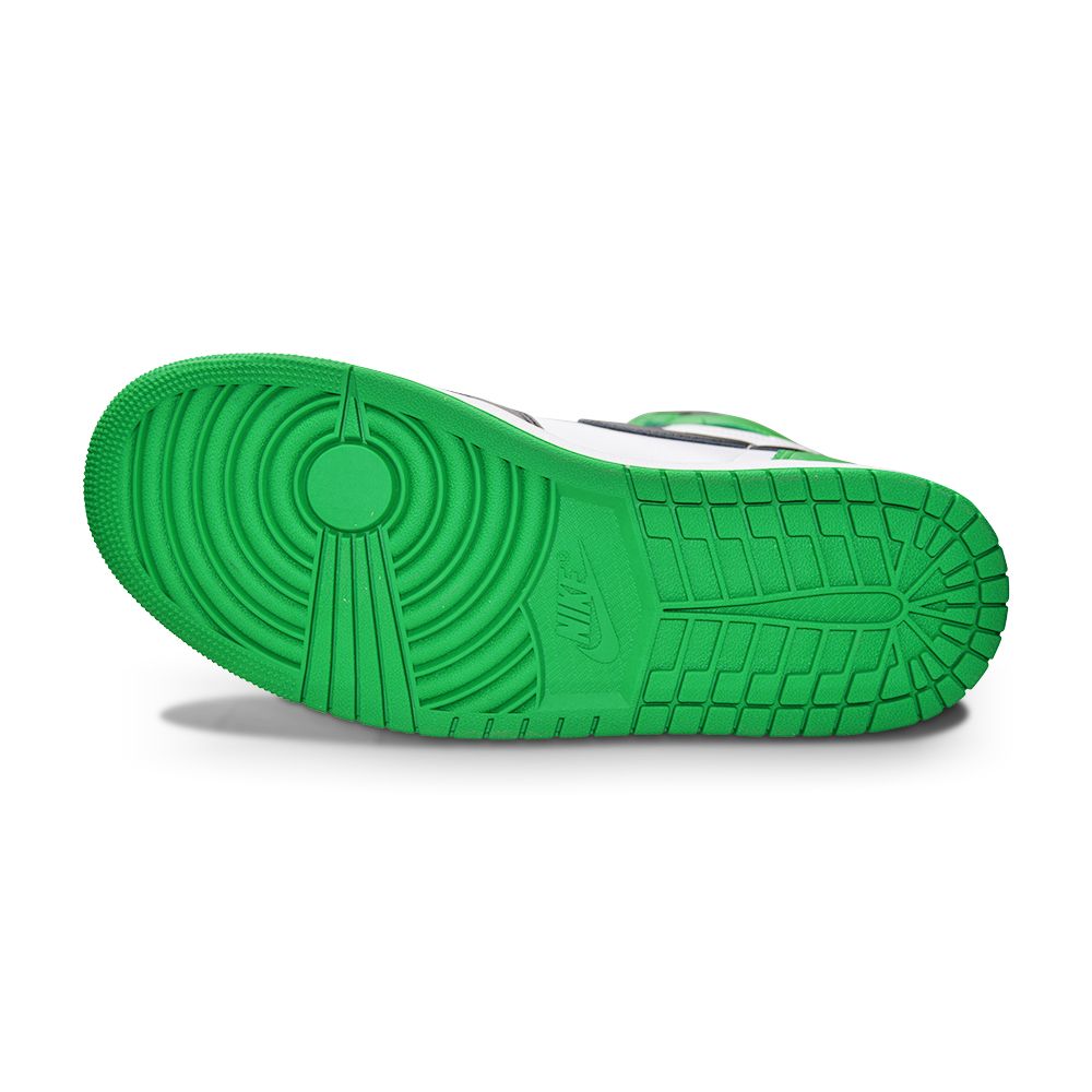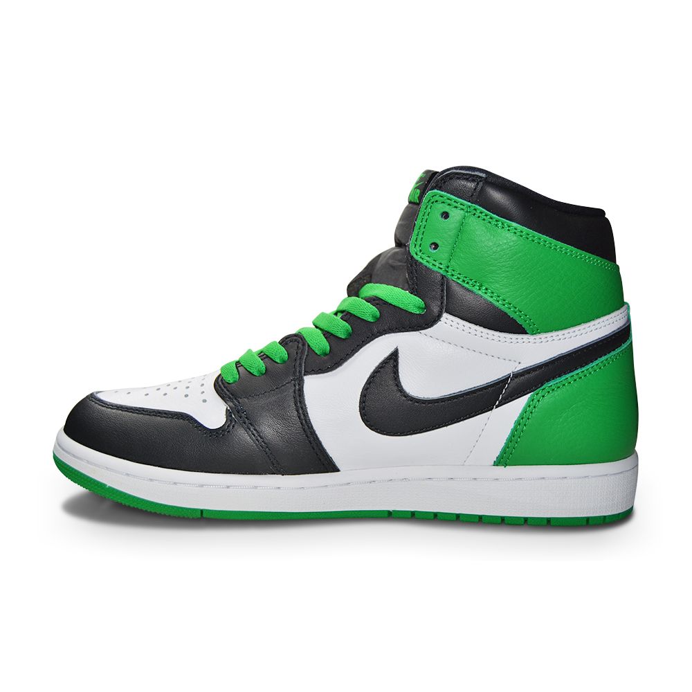 The Air Jordan 1 Retro High OG is constructed using a leather upper, brought to life with shades of white, black and Lucky Green throughout. Lucky Green Nike branding sits on top of the black tongue and insoles of the sneaker. The sneakers are tied together with Lucky Green laces.