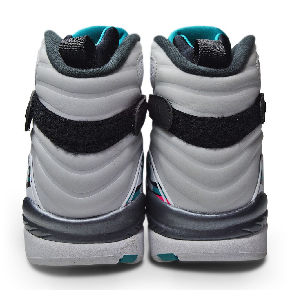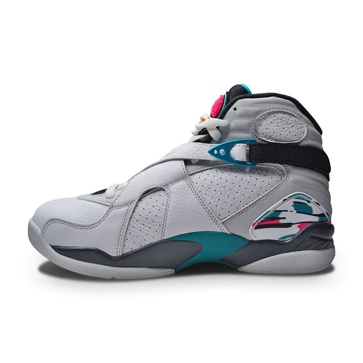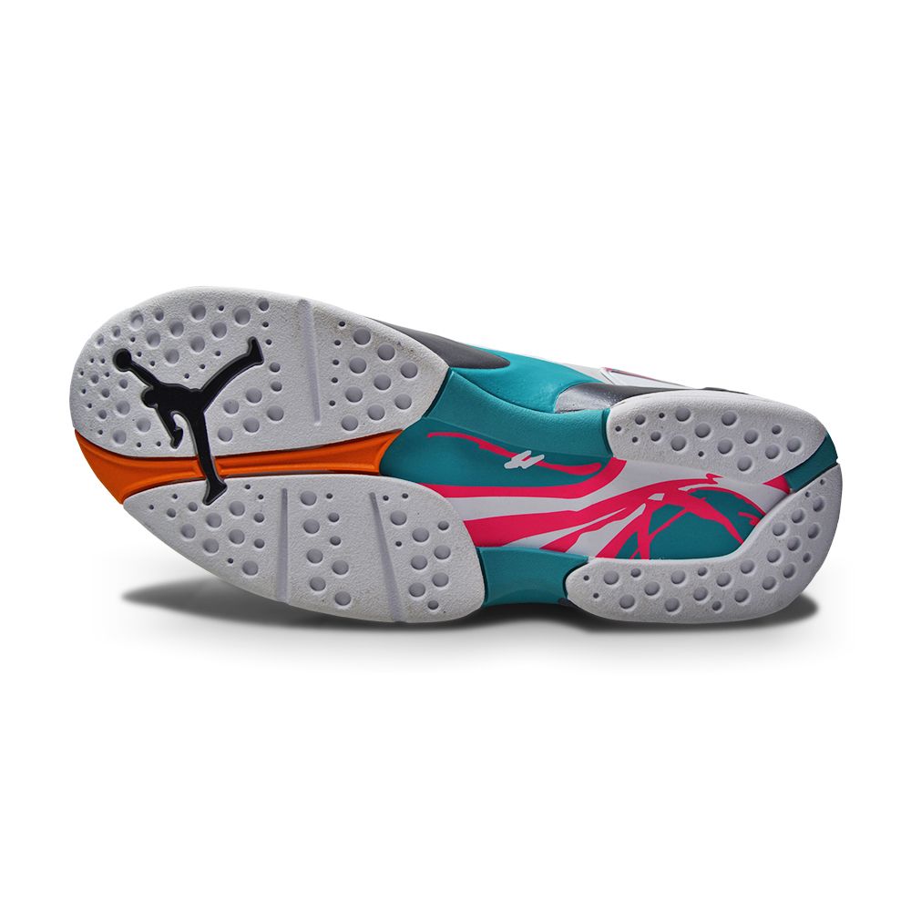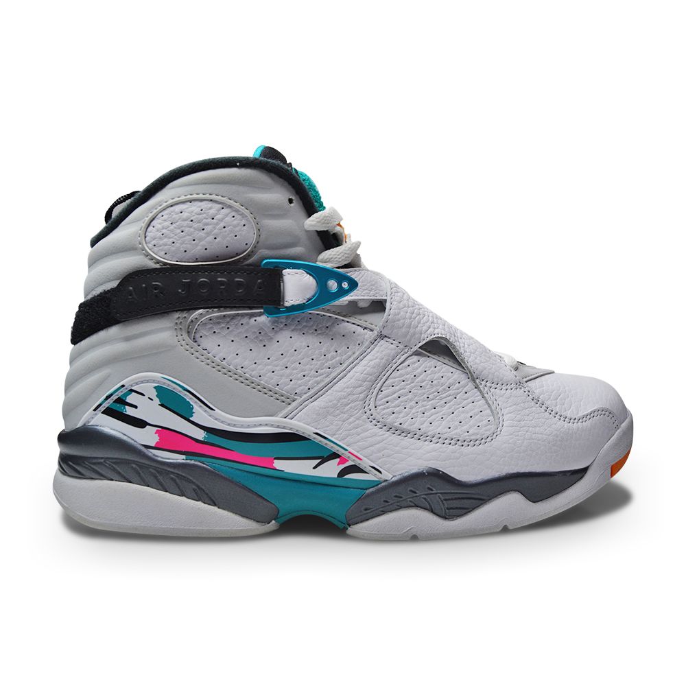 The Air Jordan 8 Retro ‘South Beach’ earns its unofficial moniker through a color scheme that presents a radical departure from the silhouette’s OG Chicago Bulls colorways. A white leather upper – featuring perforated paneling on the quarter panel – is accented with overlays adorned with streaks of Turbo Green and pink.
