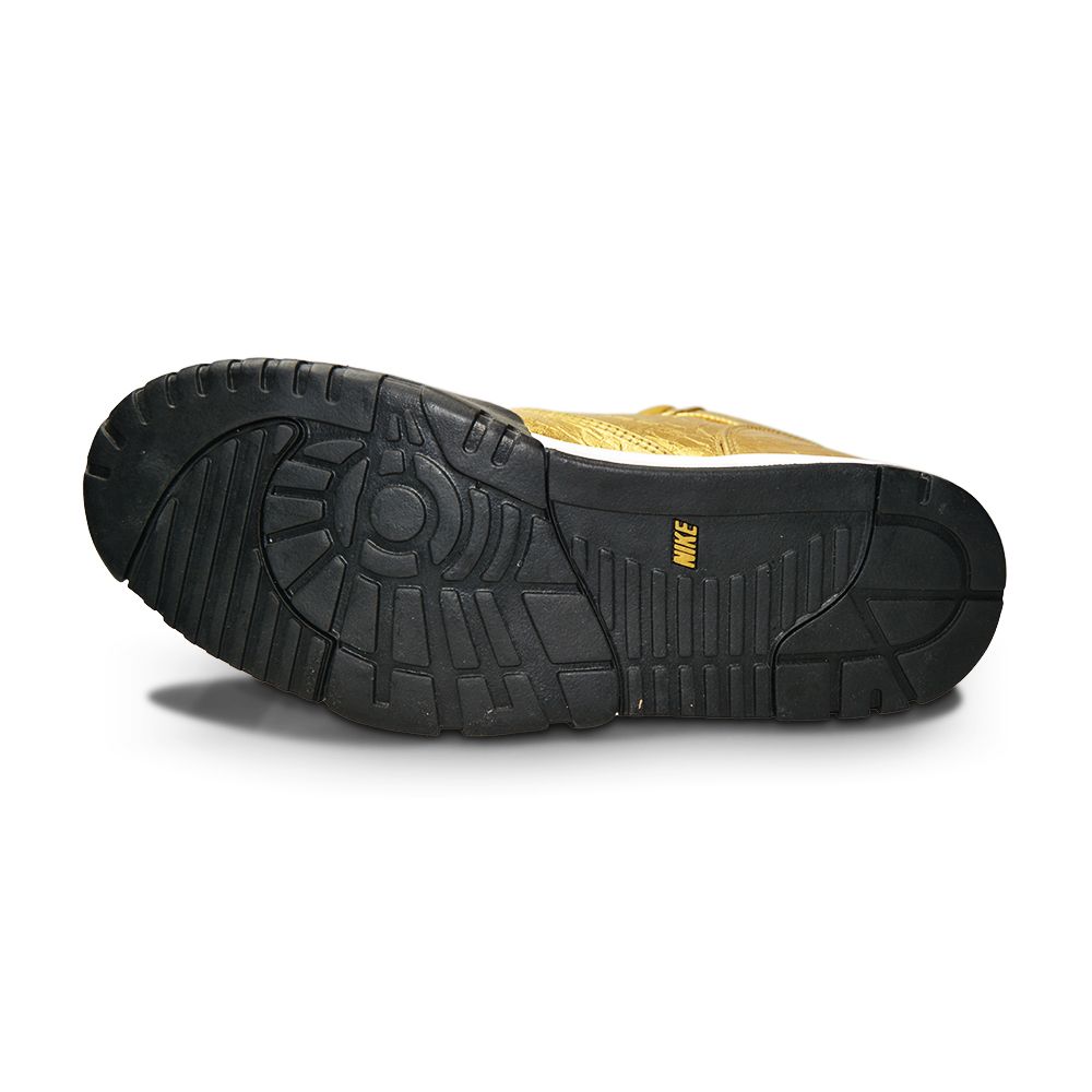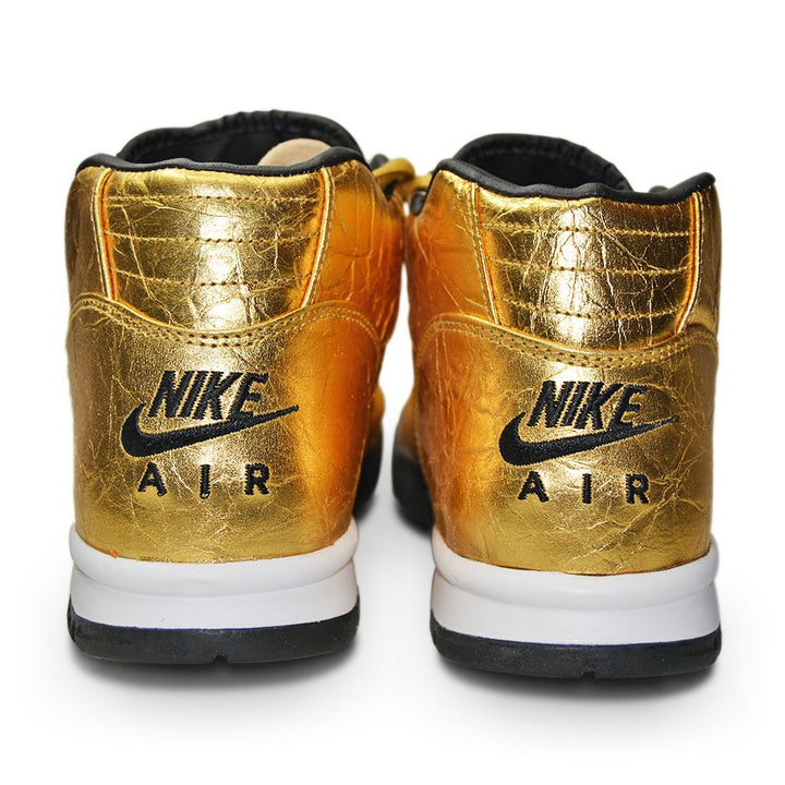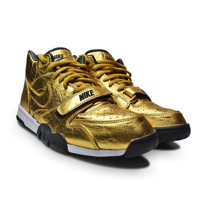 To commemorate Super Bowl 50, Nike colored the Air Trainer 1 silhouette with a bright metallic gold color scheme throughout the upper, featuring a crackled foil texture. Contrasting the shiny appearance is a white midsole and black accents that appear on the sockliner, outsole, and branding.
