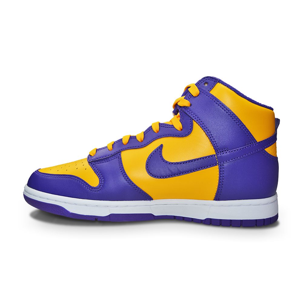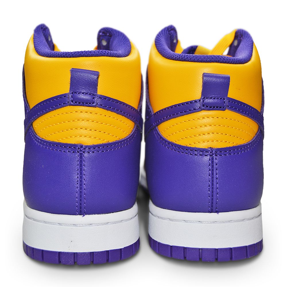 This offering of the Nike Dunk High features a University Gold leather base with matching mesh tongues, laces, and insole branding. Court Purple overlays, Swooshes, tongue branding, lining, insoles, and rubber outsole atop a White midsole completes the design.